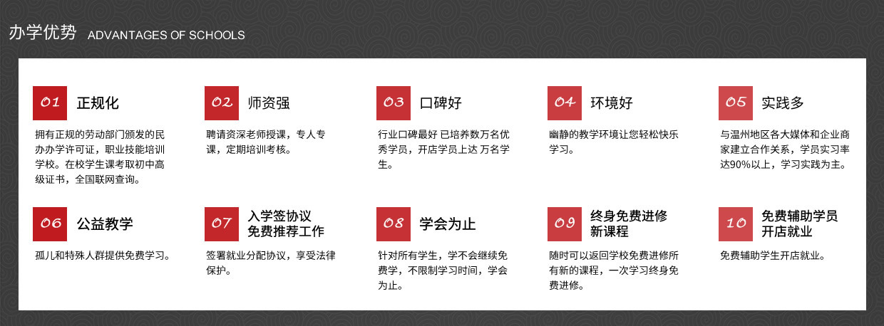 我校以培養(yǎng)實(shí)用型專(zhuān)業(yè)人才為目標(biāo),理論學(xué)習(xí)、操作訓(xùn)練與專(zhuān)業(yè)實(shí)踐三位一體,實(shí)行一對(duì)一的教學(xué)模式,常年招生,男女不限。畢業(yè)后推薦工作、 主要是以理論為輔實(shí)操為主的教學(xué)模式授課。老師手把手教、一對(duì)一輔導(dǎo),為學(xué)員量身定做課程,保證學(xué)會(huì)為止、 中途不收取任何費(fèi)用,(無(wú)任何隱形消費(fèi))進(jìn)修新的課程。、簽約教學(xué)、幫助學(xué)員開(kāi)店就業(yè),免費(fèi)試學(xué)(讓您全方位的體驗(yàn)我們的專(zhuān)業(yè)、讓你不花一分冤枉錢(qián)。)